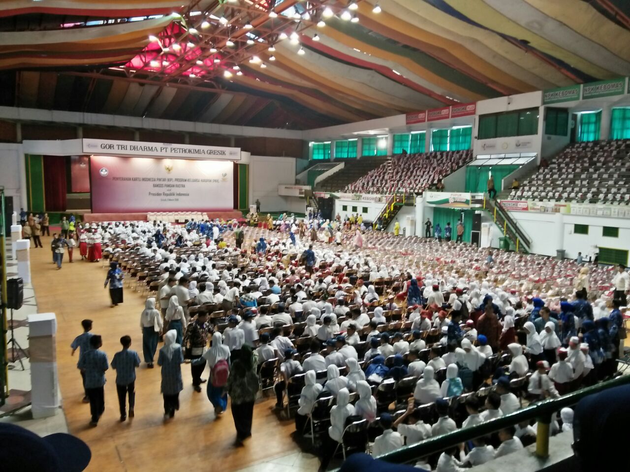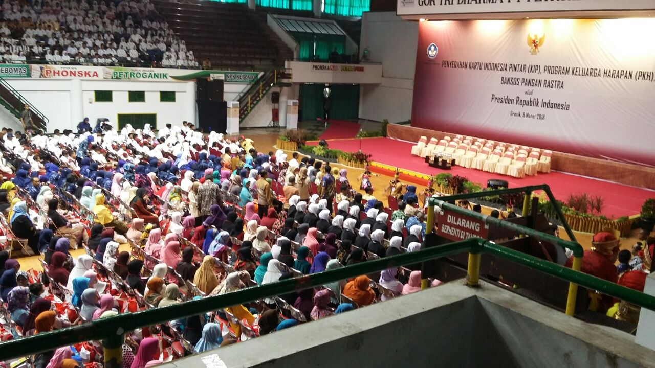 Dalam kunjungan kerjanya ke Kabupaten Gresik, Persiden RI Joko Widodo didampingi Ibu Negara Iriana Joko Widodo, Menteri Sekretaris Negara Pratikno, Menteri Pendidikan dan Kebudayaan Muhadjir Effendy, Menteri Sosial Idrus Marham, Gubernur Jawa Timur Soekarwo dan Bupati Gresik Sambari Halim Radianto. Persiden menyerahkan Kartu Indonesia Pintar (KIP) kepada 1.170 penerima. Jumlah tersebut terdiri atas 425 siswa SD, 355 siswa SMP, 175 siswa SMA/SMK, serta Paket A dan B sebanyak 40 orang bertempat di GOR Tri Dharma Gresik, pada Kamis, 8 Maret 2018.