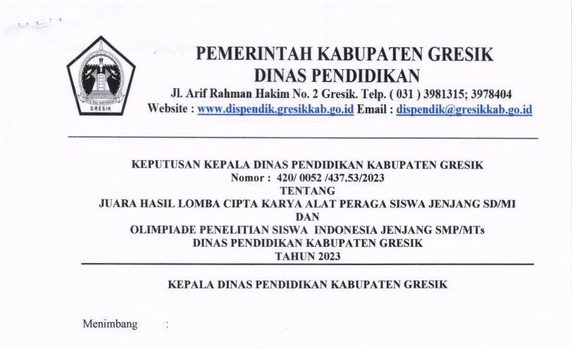 Pemerintah Kabupaten Gresik melalui Dinas Pendidikan Kabupaten Gresik mendapatkan 5 penghargaan