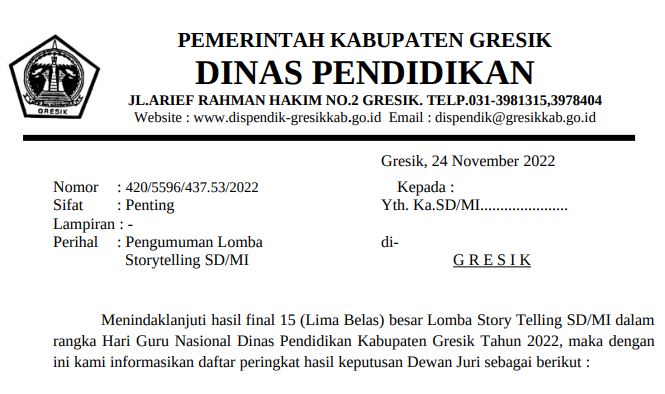 Continue Reading...Menindaklanjuti hasil final 15 (Lima Belas) besar Lomba Story Telling SD/MI dalam rangka Hari Guru