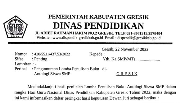 Continue Reading...Menindaklanjuti Pengumuman hasil penilaian Lomba Penulisan Buku Antologi Siswa SMP dalam rangka